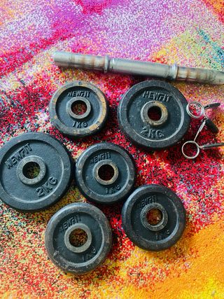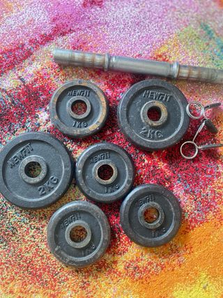Set de pesas de la marca Newfit, ideal para entrenamientos en casa. - Dos discos de 2kg. - Cuatro discos de 1kg. - Barra de pesas. - Cierres para la barra.