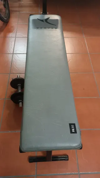 Banco de pesas DOMYOS PA350 para trabajar los abdominales y otros músculos. - Tapicería gris. - Soporte para piernas acolchado. - Estructura metálica negra.