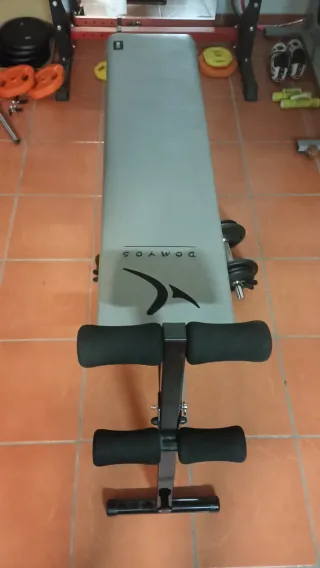 Set de pesas Domyos con maletín para guardarlas y transportarlas fácilmente. - Incluye dos barras cortas. - Incluye una barra larga. - Incluye varios tipos de discos de pesos diferente para colocar a tu gusto. - Incluye 4 cierres para las barras. El producto se encuentra en Arganda del Rey A3