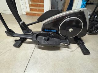 Elíptica de la marca Salter con consola digital. Estéticamente presenta defectos menores, a nivel técnico funciona a la perfección. - Sistema de freno magnético, silencioso y sin mantenimiento. - Volante de inercia equivalente a 12 kg. - Panel de control con indicadores de tiempo, distancia, velocidad, calorías, pulso y RPM. - Modos de funcionamiento manual y con programas. - Soporte para tablet/móvil en el panel de control. - Captador de pulsaciones incorporado en el manillar. - Ruedas incorporadas para un fácil desplazamiento. - Precisa conexión a corriente. - Peso máximo del usuario: 130 kg.