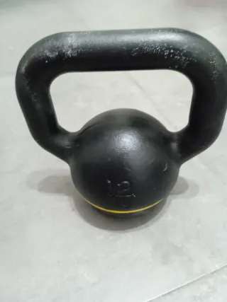 Kettlebell de 12 kg con base de goma resistente para proteger el suelo. Posee un agarre ergonómico con empuñadura ancha que facilita el agarre con 1 o 2 manos. Las manchas blancas son de magnesio para mejorar el agarre. - Peso: 12 kg - Material: Base de goma - Diseño: Agarre ergonómico - Asa: 35 mm