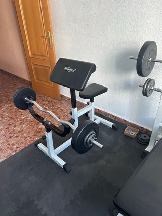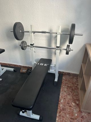 Precio en Decathlon 350€. press de banca con barra y pesas. incluye la barra de 12.5 kilos, dos pesas de 10kg y dos pesas de 20kg. Tiene muy poco uso, estando prácticamente nuevo, solo tiene una pequeña rascada donde se ve en la última foto. Lo vendo por poco uso pero está muy bien la verdad. SOLO VENTA EN MANO.