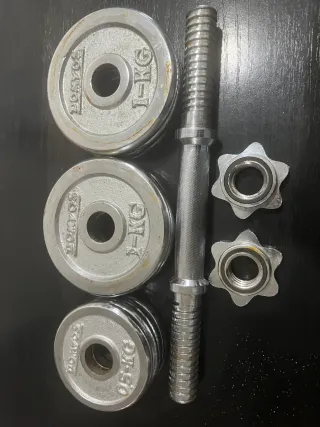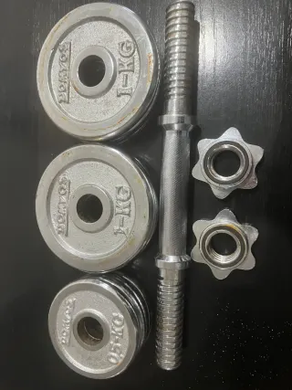 Mancuerna cromada de 9 kg, ideal para entrenar en casa. Vienen 6 discos de 1kg de peso y 4 discos de 0.50 kg de peso. Un total de 8 kg + la barra maciza de 1 kg. Con sus cierres de rosca a juego. Está en perfecto estado. Se puede ver y probar sin compromiso. A recoger en zona de Patraix