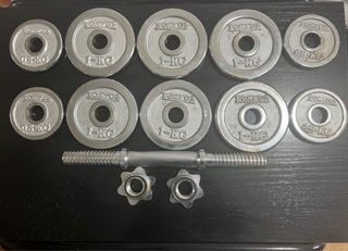 Pack de pesas que se pueden usar como mancuernas o como barra. - Incluye discos de 1.25kg, de 2kg y de 5kg. - Dos barras de mancuerna que se unen para formar una barra. - 4 cierres de seguridad rojos. 20kg en total. Nuevo sin estrenar