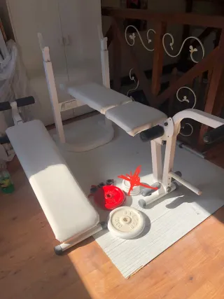 Equipo de gimnasio para entrenar en casa. - Banco de pesas acolchado. - Barra para pesas. - Discos de pesas de 4 kg, 5 kg y 10 kg.