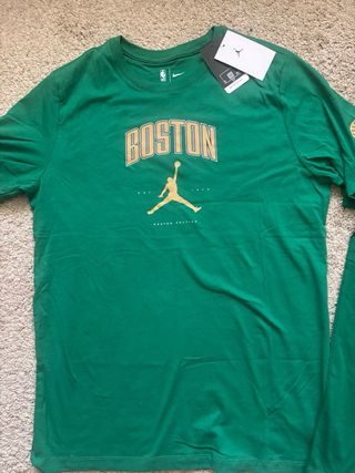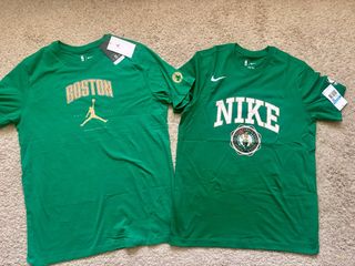 Conjunto de dos camisetas de los Boston Celtics de la NBA. - Camiseta verde con logo de Jordan y BOSTON. Talla L - Camiseta verde con logo de Nike y escudo del equipo. Talla m A pesar de diferente talla , miden igual al ser modelos distintos Equivale mas a una M la L