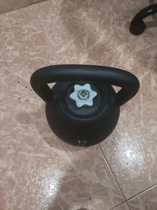 Kettlebell ajustable de Decathlon con un rango de peso de 12 a 24 kg. - Peso ajustable para diferentes ejercicios. - Diseño en color negro. Pesa 12 kg, 8 si sólo usas la campana sin la parte de abajo, y admite 6 discos de máximo 2 kg para aumentar hasta 24 kg (discos no incluidos) Sólo venta en persona