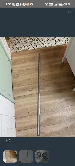 Barra de pesas de la marca Decathlon. - Longitud: 1,55 metros. - Diámetro: 28 mm.