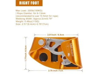 Bloqueador para pie derecho, diseñado para escalada. - Carga máxima: 330 lb (150 kg). - Diámetro de cuerda compatible: 8-13 mm (recomendado 10.5 mm). - Ancho de cincha: aprox. 2 cm / 0.79 pulgadas. - Peso: 0.46 oz (115 g). - Tamaño: 2.51 (6.4 cm) a 2.76 (7 cm).