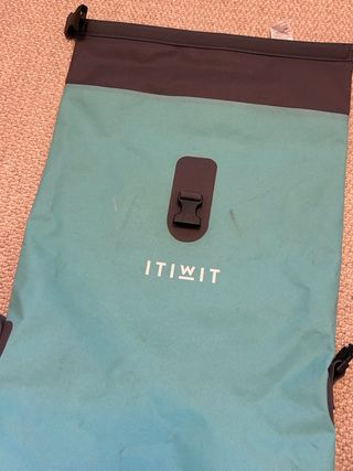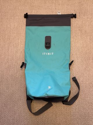 Mochila impermeable de la marca ITIWIT, ideal para transportar tus pertenencias de forma segura. - Color turquesa y gris. - Capacidad de 30 litros. - Cierre enrollable para máxima protección. - Correas ajustables para mayor comodidad. - A pesar de algún rayazo su función la cumple al 100%