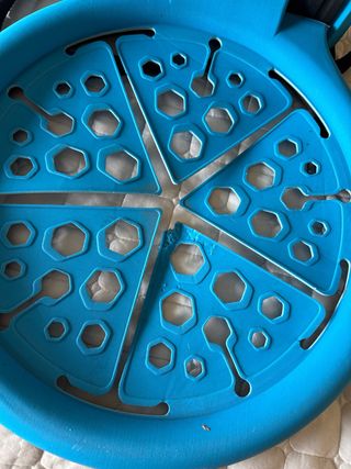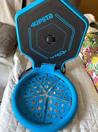 Canasta de baloncesto Kipsta modelo The Hoop. - Color azul. - Diseño plegable. - Estructura con orificios hexagonales. Solamente tiene la mordida de un pequeño cachorrito,se ve en la foto. Portátil,superligera,no pesa nada