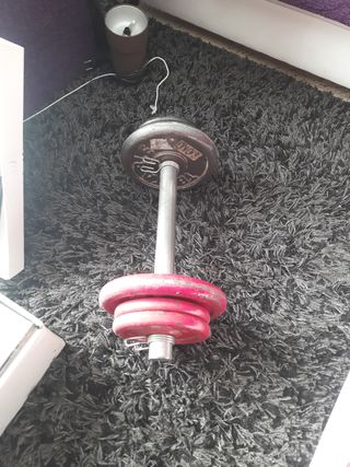Kit de BodyPump con barra y discos de pesas. - Peso total: 17,5 kg. - Incluye barra acolchada da muy cómoda - Incluye dos cierres - Discos de diferentes pesos - 2 x 5kg - 2 x 2,5kg - 2 x 1,25kg Diámetro de la barra 30mm, largo 140mm Todo en perfecto estado
