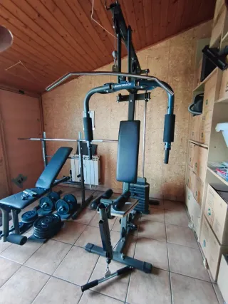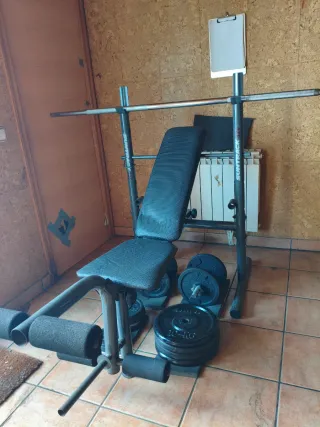 Equipo de gimnasio completo para entrenar en casa. Vendo por falta de espacio. - Máquina multifunción. - Banco de pesas regulable en altura, se puede hacer extensión de cuádriceps y femoral también. -Barra. - Juego de mancuernas. Discos: 4x1kg 4x2kg 4x5kg 4x10kg Lo único que "falla" es el asiento de la máquina que lleva un acolchado rudimentario por el desgaste del uso, el resto funciona perfectamente pero recomiendo cambiar los cables de las poleas que llevan tiempo en desuso (10/20€ en decathlon). PRECIO NEGOCIABLE