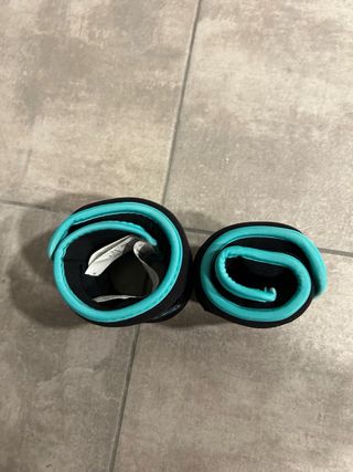 Par de pesas Domyos para tobillos o muñecas, cada una de 0.5kg. - Color negro con detalles turquesa. - Cierre de velcro ajustable. - Marca: Domyos. -Nuevos