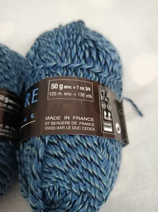 2 Ovillos de lana de la marca Bergere de France, fabricado en Francia. Ideal para tus proyectos de tejido. - Peso: 50 g (1 oz 3/4). - Longitud: 125 m (136 yds). - Color: Azul jaspeado 2 cabdells 3 euros cadascun
