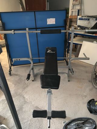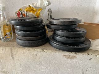 Se venden discos olimpicos de los siguientes pesos, a 2,5€el kg: 2 de 20kg 2 de 10kg 9 de 5kg 4 de 2,5kg 2 de 1,25kg Banco a 30€