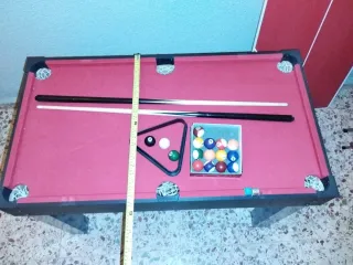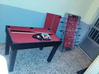 Mesa de futbolín robusta con múltiples opciones de juego. 0.80 de alto x 0,62 ancho del tablero x 1,20 de largo. Costó 500€ nuevo se vende xq a la niña le regalaron 2. Desmontada icupa poco. - FUTBOLIN, BILLAR , PING PONG y mesa diafaa de juegos de mesa o estudio. - Superficie de juego de color rojo. - Incluye tacos y juego de bolas de billar, triángulo, 2 palos, una bola de ping pong, 2 bolas de futbolín, Ideal para niños y niñas de 3 a 15 años, no es el típico que venden ahora frágil que a las dos semanas se rompe una pieza, este pesa lo suficiente para que un niño no lo estropee y lo suficiente poco para aque un adulto lo monte