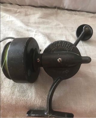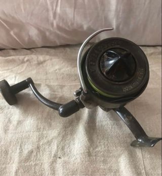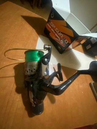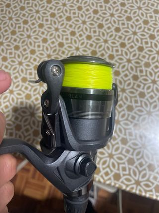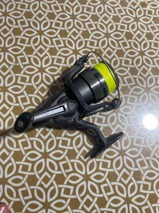 Carrete de pesca spinning en buen estado. Ideal para principiantes. - Color negro. - Incluye línea de pesca de color verde. - Ligero y fácil de usar.
