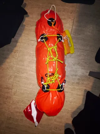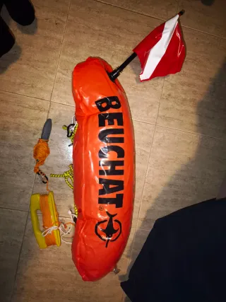 Boya hinchable de color , para pesca submarina. Incluye bandera de señalización, carrete con cabo y su cuerda. Esta personalizado por mi con cuerdas elasticas para poder enganchar todo lo necesario a la boya mientras se pesca. - Marca: Beuchat - Incluye bandera aviso de buceo. - Carrete con cabo incluido y su cuerda.