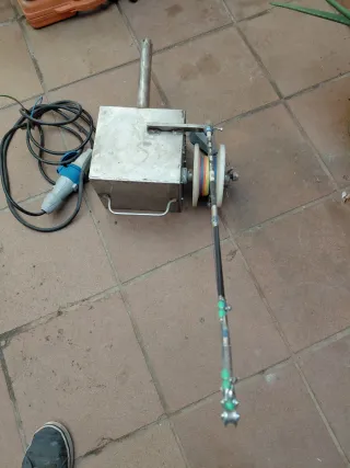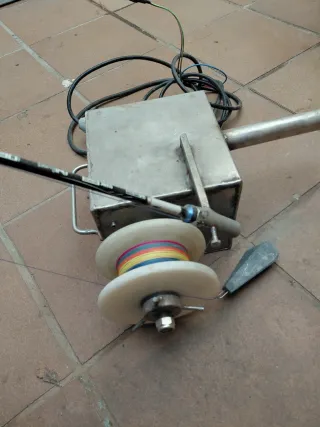 Carrete eléctrico para pesca, con bobina multihilo. - Estructura metálica. - Asa de transporte. - Cable de alimentación con enchufe. - Caña de pescar acoplada.