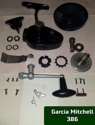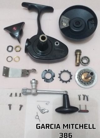Piezas de repuesto / recambio para carrete de pesca Garcia Mitchell 386. Totalmente revisadas y en perfecto estado para su uso. Ver fotos. - Cuerpo principal del carrete. - Cazoleta. - Manivela con pomo. - Engranajes. - Rodamiento. - Bobina. - Tornillos y arandelas. - Tapón de freno. - VENDO EL LOTE COMPLETO. - Sólo el tapon de freno y la manivela doblan el precio.-