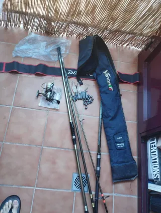 Conjunto de pesca que incluye cañas, carrete y plomos.lo que se ve en la foto, Carrete Mitchell avocet 4000 con palanca antiretroceso rota pero funciona bien, cuesta moverla pero funcionando. Caña vercelli oxigen luxus 3'90 ideal para niño, poco peso . Kali kunnan telescópica 3 metros Plomos variados para caña pequeña y la grande - Cañas de pescar. - Carrete de pesca. - Plomos para pesca. Fundas de cañas