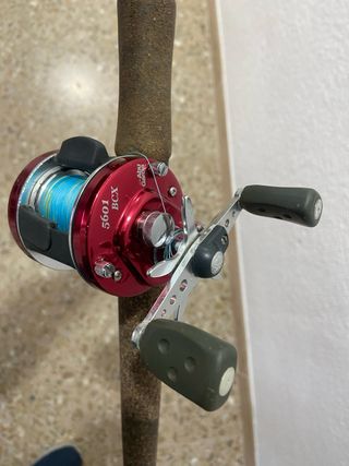 Carrete de pesca Abu Garcia modelo 5601 BCX en color rojo. - Diseño clásico y robusto. - Bobina con hilo de pesca azul y amarillo. - Mango con agarres ergonómicos.