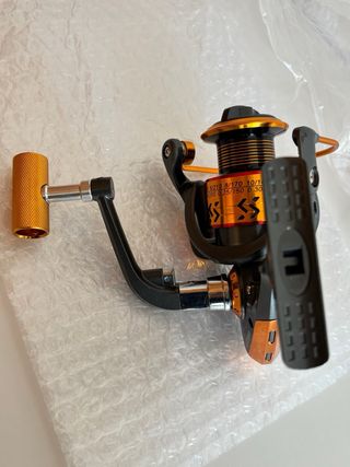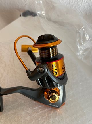 NUEVO A ESTRENAR!!🆕⭐️🚨Carrete de pesca de la marca Sougayilang, con un diseño moderno y atractivo. - Cuerpo principal en color gris oscuro. - Detalles en color naranja y dorado. - Bobina de hilo en color dorado con líneas negras y rojas. - Manivela de color dorado.