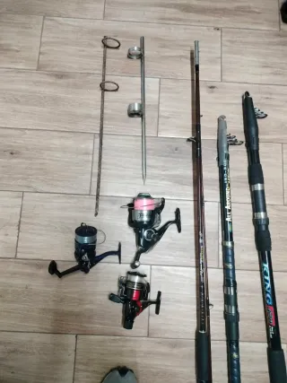 Conjunto de cañas de pesca ,carretes y pinchos las cañas son de carbono y en muy buen estado por no decir nuevas se venden en conjunto