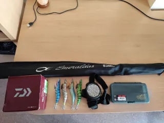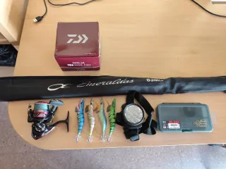 Vendo combo para la pesca del calamar compuesto por lo siguiente: -Caña Daiwa Esmeraldas EM S 83 ML-SF tope de gama en su versión de 2.51mts acción 5-21grs. -Carrete Daiwa Ninja LT3000-CXH con hilo trenzado de 0.8mm y puente de flurocarbono de 0.25mm. -4 Señuelos 3.5 de 19grs. -Funda para señuelos. -Linterta cabeza. Usado muy pocas veces de total confianza y garantía. NO ENVIO para recoger en mano zona de Elche o alrededores. ABSTENERSE MAREANTES Y BUSCADORES DE CHOLLOS POR FAVOR GRACIAS.
