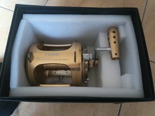 Carrete de curricán para pesca de grandes piezas, modelo FX80W, en acabado dorado.Modelo de dos velocidades , nuevo sin abrir .Tratamiento de superficie anodizada resistente a la intemperie, al óxido y a los arañazos - Ratio: 2.5:1 - 1.3:1 - Capacidad: 80lb/1025YDS -Alta potencia para pesca ofrece 80 kg de fuerza para capturas de gran tamaño en el mar. Eficiente de refrigeración:Con 105°C de volatilidad ,mantiene su rendimiento durante largas jornadas de pesca. Embrague de alta capacidad de carbono Es perfecto para trolleo y jigging lento, adaptándose a diferentes métodos de pesca.