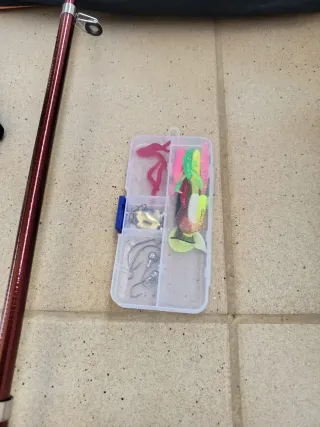Dos cañas de pescar más un carrete etc.... Luz que brilla por la noche para saber dónde está el anzuelo, anzuelos,cañas etc