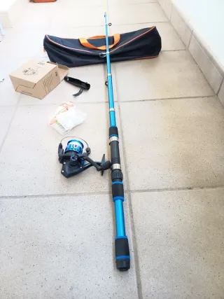 Caña de pesca para surfcasting telescopica. - Color azul con detalles amarillos. - Incluye carrete. - longitud 3.00m -Acción 80g-150g