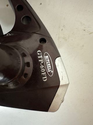 Carrete de pesca Mitchell P-60FD con línea amarilla. - Capacidad de línea: 0.25/140, 0.30/100, 0.35/80. - Color: Marrón oscuro y plateado.