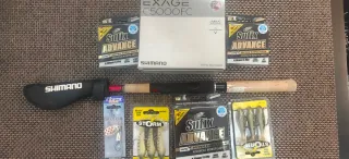 Conjunto de pesca completo con caña, carrete y señuelos. - Caña de pescar Shimano. - Carrete de pesca Shimano. - Hilo de pesca Sufix Advance. - Señuelos de pesca Storm y Vibrax.