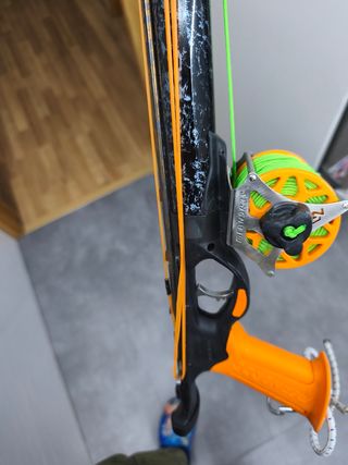Fusil completo con carrete lleno y doble goma. Es en medida 95 cm, está nuevo solo lo he metido al agua una vez para probarlo.