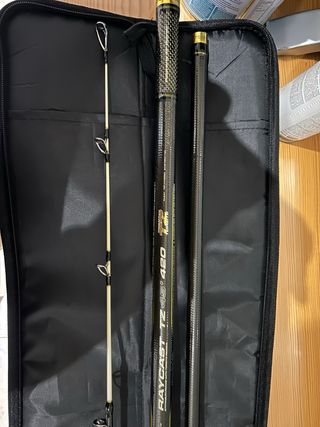 Se vende equipo completo para la pesca de surfcasting. - Cañero doble negro. - Funda para cañas Cinnetic. - Bolsa de pesca Cinnetic naranja. -pareja cañas cinnetic raycast TZ -pareja carretes shimano xsb 14000 Solo 2 salidas de pesca equipo como nuebo.