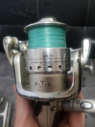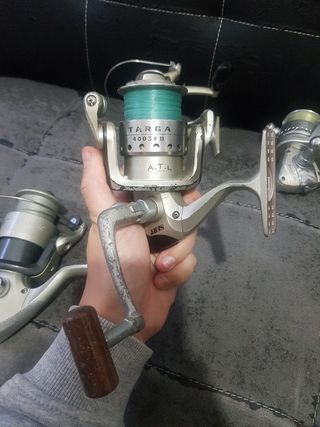 Se venden dos carretes de pesca, uno de la marca Targa y otro Sert. El carrete Targa es el modelo 4003FD y cuenta con sistema ATL (Anti Twisted Line). - Carrete Targa 4003FD con línea verde. - Carrete Sert con mango de madera.