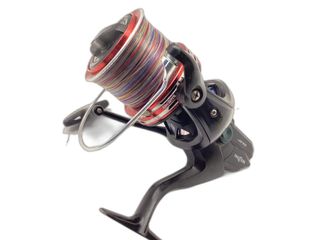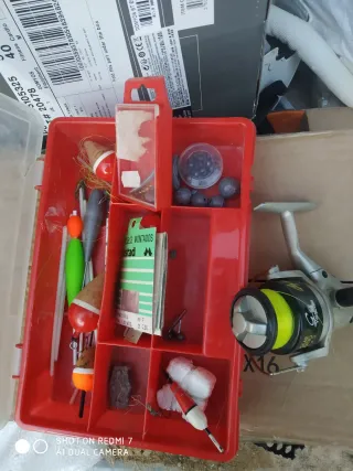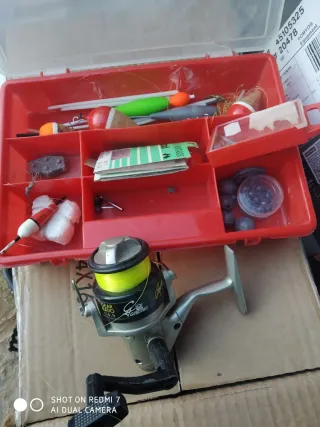 Carrete de pesca + caja con accesorios