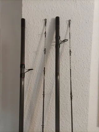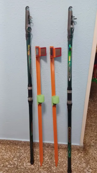 2 cañas de pescar , dos carretes y dos soportes