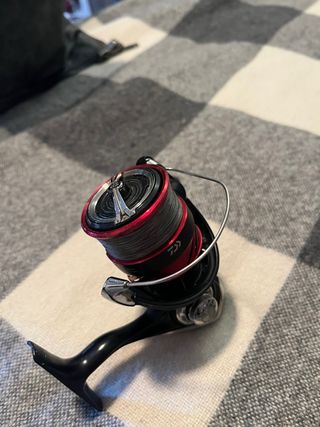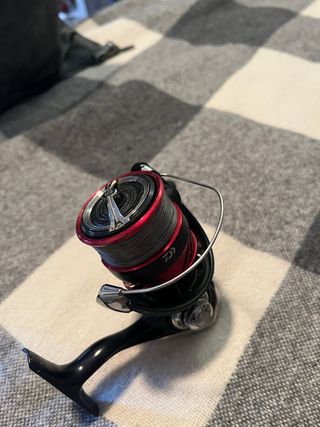 Carrete de pesca Daiwa Ninja LT3000 en color negro y rojo. - Diseño moderno y ligero. - Bobina de aluminio. - Mango plegable.