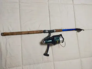 Se vende caña de pescar completa con carrete. - Caña de pescar de color verde y negro. - Carrete de pesca. - Mango de goma negro con tapa azul.teléfono 622 44 50 78