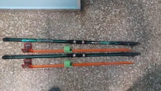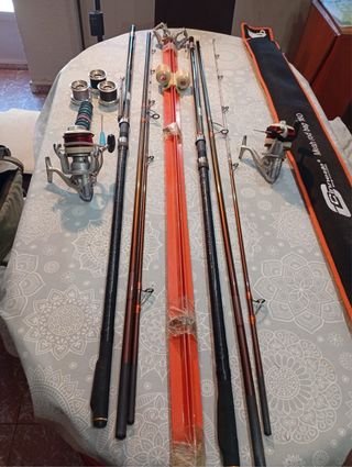 Se venden dos cañas de pescar de color verde con carretes y lanzas de playa naranjas. - Cañas de pescar de color verde. - Carrete de pesca. - Lanzas de playa naranjas.