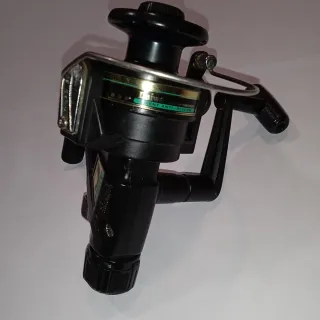 Carrete de spinning DEUKIO modelo 800, ideal para la pesca de trucha. Presenta un diseño en color negro y verde. - Cuerpo principal en negro. - Detalles en verde. - Manivela con empuñadura negra.