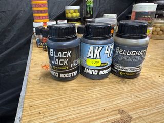 Lote de cebos para pesca, incluyendo Black Jack, AK 47 y Belughan Booster. - Black Jack Amino Booster. - AK 47 Amino Booster. - Belughan Booster Russian Kaviar. algunos está nuevos y otro usados precio negociable