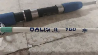 Caña de pesca diseñada para su uso en embarcaciones. - Mango de goma azul. - Anillas para sedal.