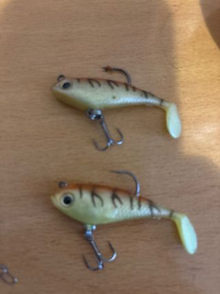 Lote de 3 señuelos de pesca variados, listos para usar. Dos señuelos de ........4,5 cms Un señuelo de............. 7 cms - Incluye 3 señuelos de diferentes colores y tamaños más el plomo de 100grms.