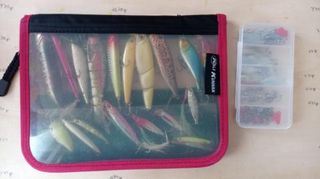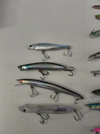 Lote variado de señuelos de pesca, ideal para diferentes técnicas y especies. - Incluye señuelos de la marca Lumirátun. - Varios modelos y colores disponibles. - Algunos señuelos vienen en su empaque original. - Se incluyen anzuelos Inox.