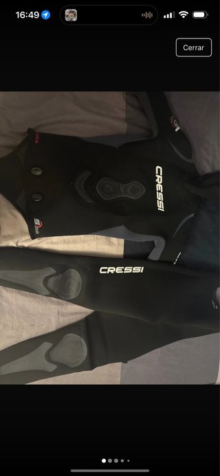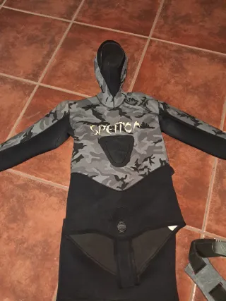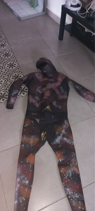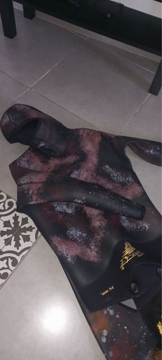 Traje de pesca submarina CRESSI con diseño de camuflaje, solo se utilizo 2 veces . - Parte superior con capucha integrada. - Parte inferior tipo culotte. - Diseño de camuflaje en tonos morados y verdes. talla L/4 5 milimetros la chaqueta solo tiene eso que se puede ver de sacar el traje , marca de uñas , reparado. el pantalon tiene alguna tambien reparado. el traje se utilizo 2 veces, lo blanco ,es polvo de taco para su conservacion. pesca submarina PRECIO NO NEGOCIABLE TAMBIEN ACEPTARIA CAMBIO POR UN TRAJE CRESSI DE PESCA SUBMARINA TALLA 5 XL. QUE ESTE MAS O MENOS EN LAS MISMA CONDICIONES. disponible hasta el domingo.