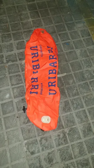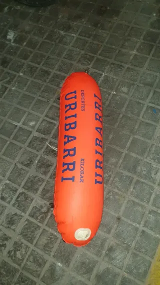 Boya de pesca submarina de color naranja con el logo de URRIBARRI y DEPORTES KILORAK. - Color naranja brillante. - Diseño cilíndrico. - Marcaje de marca visible.